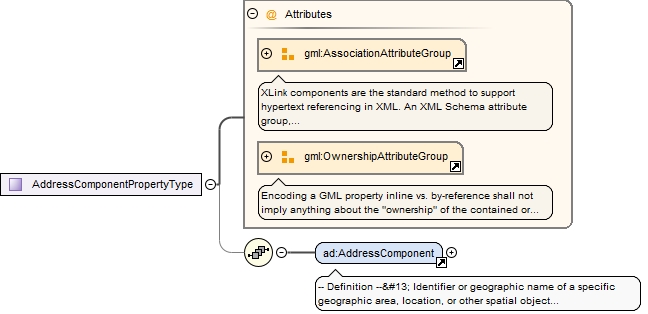 <element name="AddressComponent" type="ad:AddressComponentType" abstract="true" substitutionGroup="gml:AbstractFeature"><annotation><documentation>-- Definition -- Identifier or geographic name of a specific geographic area, location, or other spatial object which defines the scope of an address. -- Description -- NOTE 1 Four different subclasses of address components are defined: o Administrative unit name, which may include name of country, name of municipality, name of district o Address area name like e.g. name of village or settlement o Thoroughfare name, most often road name o Postal descriptor In order to construct an address, these subclasses are often structured hierarchically. NOTE 2 It is the combination of the address locator and the address components, which makes a specific address spatial object readable and unambiguous for the human user. EXAMPLE The combination of the locator "13" and the address components "Calle Mayor" (thoroughfare name), "Cortijo del Marqués" (address area name), "41037" (postal descriptor), "Écija", "Sevilla" and "España" (administrative unit names) makes this specific address spatial object readable and unambiguous.</documentation></annotation></element>