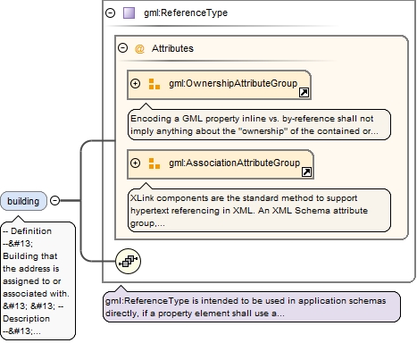<element name="building" type="gml:ReferenceType" nillable="true" minOccurs="0" maxOccurs="unbounded"><annotation><documentation>-- Definition -- Building that the address is assigned to or associated with. -- Description -- NOTE An address could potentially have an association to zero, one or several buildings. Also it is possible (but this is not expressed in this application schema) that several addresses are associated to a single building. EXAMPLE In Praha, The Czech Republic, the address designated "NaPankráci 1690/125" is associated to a specific building in the street, in this case the building with number 1690 in the district (cz: cast obce) "Nusle".</documentation><appinfo><targetElement xmlns="http://www.opengis.net/gml/3.2">bui:Building</targetElement></appinfo></annotation></element>