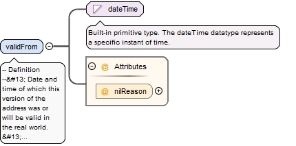 <element name="validFrom" nillable="true"><annotation><documentation>-- Definition -- Date and time of which this version of the address component was or will be valid in the real world. -- Description -- NOTE This date and time can be set in the future for situations where an address component or a version of an address component has been decided by the appropriate authority to take effect for a future date.</documentation></annotation><complexType><simpleContent><extension base="dateTime"><attribute name="nilReason" type="gml:NilReasonType"/></extension></simpleContent></complexType></element>