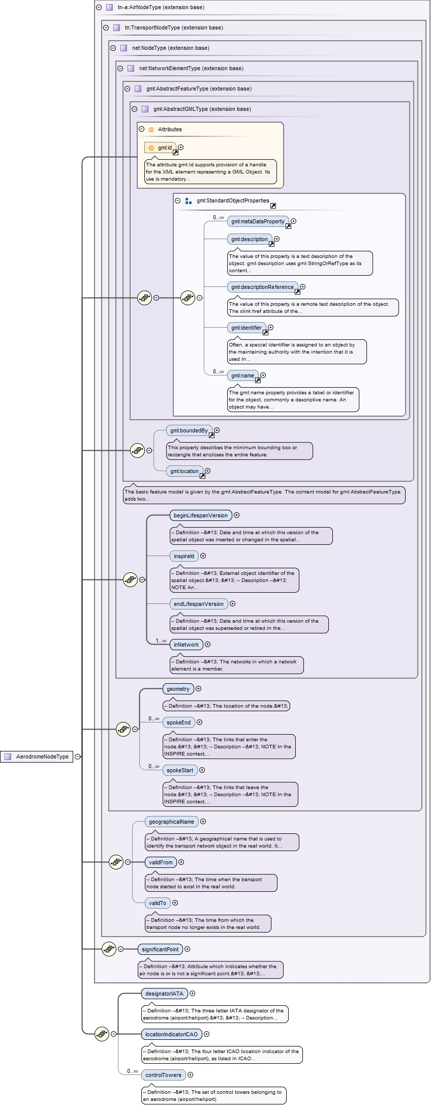 <complexType name="AerodromeNodeType"><complexContent><extension base="tn-a:AirNodeType"><sequence><element name="designatorIATA" nillable="true"><annotation><documentation>-- Definition -- The three letter IATA designator of the aerodrome (airport/heliport). -- Description -- SOURCE [AIXM5.0]. </documentation></annotation><complexType><simpleContent><extension base="string"><attribute name="nilReason" type="gml:NilReasonType"/></extension></simpleContent></complexType></element><element name="locationIndicatorICAO" nillable="true"><annotation><documentation>-- Definition -- The four letter ICAO location indicator of the aerodrome (airport/heliport), as listed in ICAO DOC 7910. -- Description -- SOURCE [AIXM5.0]. </documentation></annotation><complexType><simpleContent><extension base="string"><attribute name="nilReason" type="gml:NilReasonType"/></extension></simpleContent></complexType></element><element maxOccurs="unbounded" minOccurs="0" name="controlTowers" nillable="true" type="gml:ReferenceType"><annotation><documentation>-- Definition -- The set of control towers belonging to an aerodrome (airport/heliport).</documentation><appinfo><targetElement xmlns="http://www.opengis.net/gml/3.2">bui:ControlTower</targetElement><reversePropertyName xmlns="http://www.opengis.net/gml/3.2">bui:airportHeliport</reversePropertyName></appinfo></annotation></element></sequence></extension></complexContent></complexType>