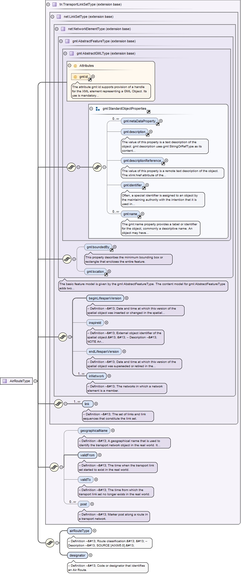 <complexType name="AirRouteType"><complexContent><extension base="tn:TransportLinkSetType"><sequence><element name="airRouteType" nillable="true"><annotation><documentation>-- Definition -- Route classification. -- Description -- SOURCE [AIXM5.0]. </documentation></annotation><complexType><simpleContent><extension base="gml:CodeType"><attribute name="nilReason" type="gml:NilReasonType"/></extension></simpleContent></complexType></element><element name="designator" nillable="true"><annotation><documentation>-- Definition -- Code or designator that identifies an Air Route.</documentation></annotation><complexType><simpleContent><extension base="string"><attribute name="nilReason" type="gml:NilReasonType"/></extension></simpleContent></complexType></element></sequence></extension></complexContent></complexType>