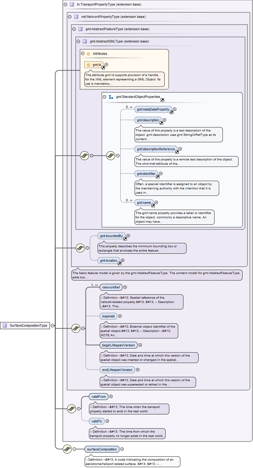 <complexType name="SurfaceCompositionType"><complexContent><extension base="tn:TransportPropertyType"><sequence><element name="surfaceComposition" type="gml:CodeType"><annotation><documentation>-- Definition -- A code indicating the composition of an aerodrome/heliport related surface. -- Description -- SOURCE [SurfaceCharacteristics.composition - AIXM5.0]. EXAMPLES Asphalt, concrete. </documentation></annotation></element></sequence></extension></complexContent></complexType>