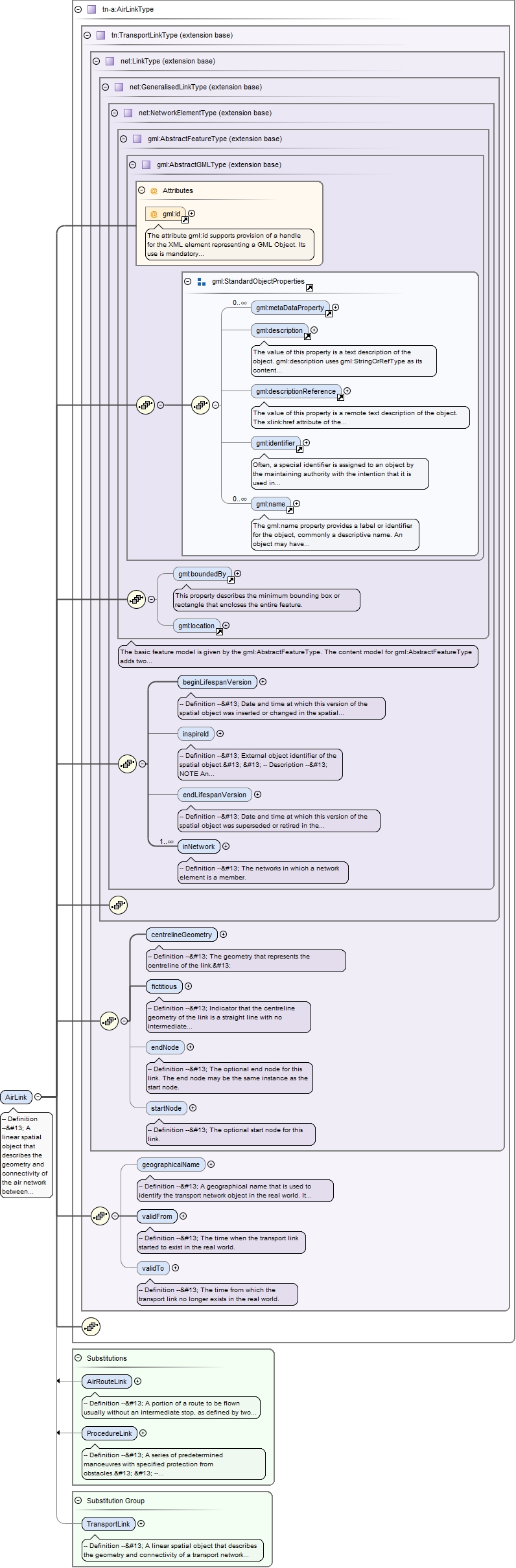<element abstract="true" name="AirLink" substitutionGroup="tn:TransportLink" type="tn-a:AirLinkType"><annotation><documentation>-- Definition -- A linear spatial object that describes the geometry and connectivity of the air network between two points in the network.</documentation></annotation></element>