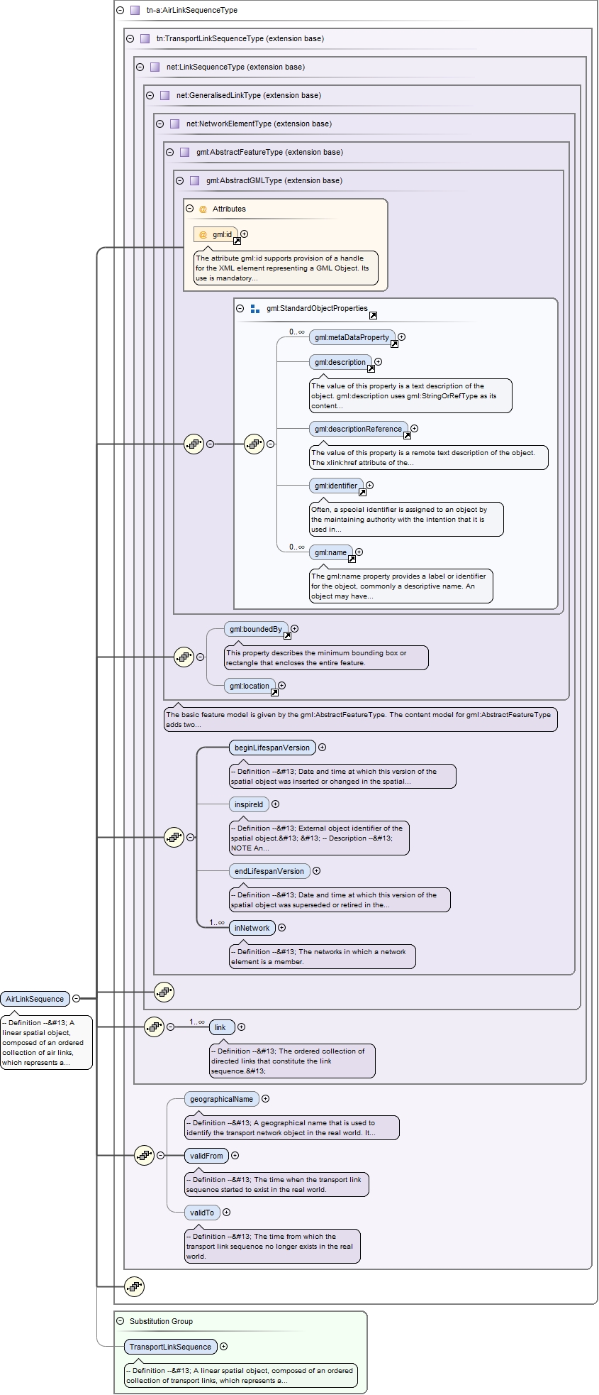 <element name="AirLinkSequence" substitutionGroup="tn:TransportLinkSequence" type="tn-a:AirLinkSequenceType"><annotation><documentation>-- Definition -- A linear spatial object, composed of an ordered collection of air links, which represents a continuous path in the air network without any branches. -- Description -- NOTE 1 The element has a defined beginning and end and every position on the air link sequence is identifiable with one single parameter such as length. It describes an element of the air network, which could be characterized by one or more thematical identifiers and/or properties. NOTE 2 This collection of air links is equivalent to RoutePortion feature in AIXM5.0. RoutePortion: A group of two or more consecutive segments of the same route, which have the usage and/or the same flight restrictions [AIXM5.0]. </documentation></annotation></element>