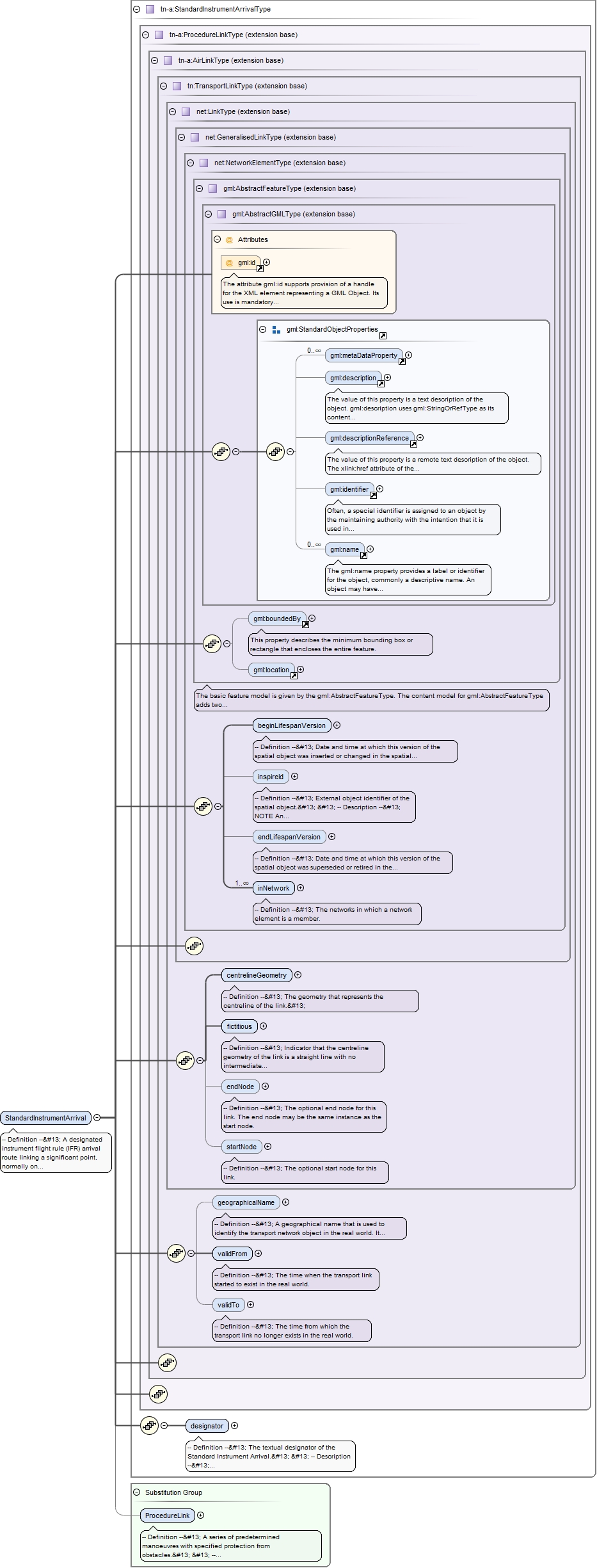 <complexType name="StandardInstrumentArrivalType"><complexContent><extension base="tn-a:ProcedureLinkType"><sequence><element name="designator" nillable="true"><annotation><documentation>-- Definition -- The textual designator of the Standard Instrument Arrival. -- Description -- SOURCE [AIXM5.0]. </documentation></annotation><complexType><simpleContent><extension base="string"><attribute name="nilReason" type="gml:NilReasonType"/></extension></simpleContent></complexType></element></sequence></extension></complexContent></complexType>