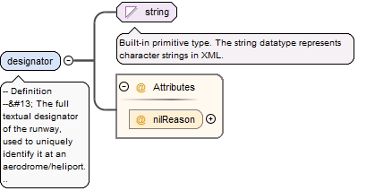 <element name="designator" nillable="true"><annotation><documentation>-- Definition -- The full textual designator of the runway, used to uniquely identify it at an aerodrome/heliport which has more than one. -- Description -- SOURCE [AIXM5.0].</documentation></annotation><complexType><simpleContent><extension base="string"><attribute name="nilReason" type="gml:NilReasonType"/></extension></simpleContent></complexType></element>
