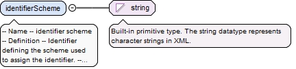 <element name="identifierScheme" type="string"><annotation><documentation>-- Name -- identifier scheme -- Definition -- Identifier defining the scheme used to assign the identifier. -- Description -- NOTE 1: Reporting requirements for different environmental legislation mandate that each spatial object is assigned an identifier conforming to specific lexical rules. NOTE 2: These rules are often inconsistent so a spatial object may be assigned multiple identifiers which are used for object referencing to link information to the spatial object.</documentation></annotation></element>