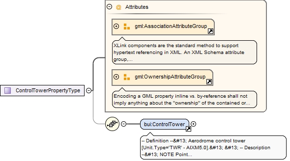 <complexType name="ControlTowerType"><complexContent><extension base="gml:AbstractFeatureType"><sequence><element name="airportHeliport" nillable="true" type="gml:ReferenceType"><annotation><documentation>-- Definition -- The aerodrome (airport/heliport) to which the control tower belongs.</documentation><appinfo><targetElement xmlns="http://www.opengis.net/gml/3.2">tn-a:AerodromeNode</targetElement><reversePropertyName xmlns="http://www.opengis.net/gml/3.2">tn-a:controlTowers</reversePropertyName></appinfo></annotation></element></sequence></extension></complexContent></complexType>