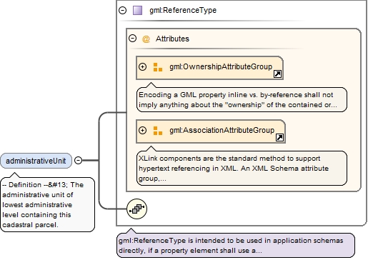 <complexType name="CadastralParcelType"><complexContent><extension base="gml:AbstractFeatureType"><sequence><element minOccurs="0" name="areaValue" nillable="true"><annotation><documentation>-- Definition -- Registered area value giving quantification of the area projected on the horizontal plane of the cadastral parcel.</documentation></annotation><complexType><simpleContent><extension base="gml:AreaType"><attribute name="nilReason" type="gml:NilReasonType"/></extension></simpleContent></complexType></element><element name="beginLifespanVersion" nillable="true"><annotation><documentation>-- Definition -- Date and time at which this version of the spatial object was inserted or changed in the spatial data set. </documentation></annotation><complexType><simpleContent><extension base="dateTime"><attribute name="nilReason" type="gml:NilReasonType"/></extension></simpleContent></complexType></element><element minOccurs="0" name="endLifespanVersion" nillable="true"><annotation><documentation>-- Definition -- Date and time at which this version of the spatial object was superseded or retired in the spatial data set. </documentation></annotation><complexType><simpleContent><extension base="dateTime"><attribute name="nilReason" type="gml:NilReasonType"/></extension></simpleContent></complexType></element><element name="geometry" type="gml:GeometryPropertyType"><annotation><documentation>-- Definition -- Geometry of the cadastral parcel. -- Description -- As much as possible, the geometry should be a single area.</documentation></annotation></element><element name="inspireId" type="base:IdentifierPropertyType"><annotation><documentation>-- Definition -- External object identifier of the spatial object. -- Description -- NOTE An external object identifier is a unique object identifier published by the responsible body, which may be used by external applications to reference the spatial object. The identifier is an identifier of the spatial object, not an identifier of the real-world phenomenon. </documentation></annotation></element><element name="label" type="string"><annotation><documentation>-- Definition -- Text commonly used to display the cadastral parcel identification. -- Description -- NOTE 1 The label is usually the last part of the national cadastral reference. NOTE 2 The label can be used for label in portrayal.</documentation></annotation></element><element name="nationalCadastralReference" type="string"><annotation><documentation>-- Definition -- Thematic identifier at national level, generally the full national code of the cadastral parcel. Must ensure the link to the national cadastral register or equivalent. -- Description -- The national cadastral reference can be used also in further queries in national services.</documentation></annotation></element><element minOccurs="0" name="referencePoint" nillable="true" type="gml:PointPropertyType"><annotation><documentation>-- Definition -- A point within the cadastral parcel. -- Description -- EXAMPLE The centroid of the cadastral parcel geometry.</documentation></annotation></element><element minOccurs="0" name="validFrom" nillable="true"><annotation><documentation>-- Definition -- Official date and time the cadastral parcel was/will be legally established. -- Description -- NOTE This is the date and time the national cadastral reference can be used in legal acts. </documentation></annotation><complexType><simpleContent><extension base="dateTime"><attribute name="nilReason" type="gml:NilReasonType"/></extension></simpleContent></complexType></element><element minOccurs="0" name="validTo" nillable="true"><annotation><documentation>-- Definition -- Date and time at which the cadastral parcel legally ceased/will cease to be used. -- Description -- NOTE This is the date and time the national cadastral reference can no longer be used in legal acts. </documentation></annotation><complexType><simpleContent><extension base="dateTime"><attribute name="nilReason" type="gml:NilReasonType"/></extension></simpleContent></complexType></element><element maxOccurs="unbounded" minOccurs="0" name="basicPropertyUnit" nillable="true" type="gml:ReferenceType"><annotation><documentation>-- Definition -- The basic property unit(s) containing this cadastral parcel.</documentation><appinfo><targetElement xmlns="http://www.opengis.net/gml/3.2">cp:BasicPropertyUnit</targetElement></appinfo></annotation></element><element minOccurs="0" name="administrativeUnit" nillable="true" type="gml:ReferenceType"><annotation><documentation>-- Definition -- The administrative unit of lowest administrative level containing this cadastral parcel.</documentation><appinfo><targetElement xmlns="http://www.opengis.net/gml/3.2">au:AdministrativeUnit</targetElement></appinfo></annotation></element><element minOccurs="0" name="zoning" nillable="true" type="gml:ReferenceType"><annotation><documentation>-- Definition -- The cadastral zoning of lowest level containing this cadastral parcel.</documentation><appinfo><targetElement xmlns="http://www.opengis.net/gml/3.2">cp:CadastralZoning</targetElement></appinfo></annotation></element></sequence></extension></complexContent></complexType>