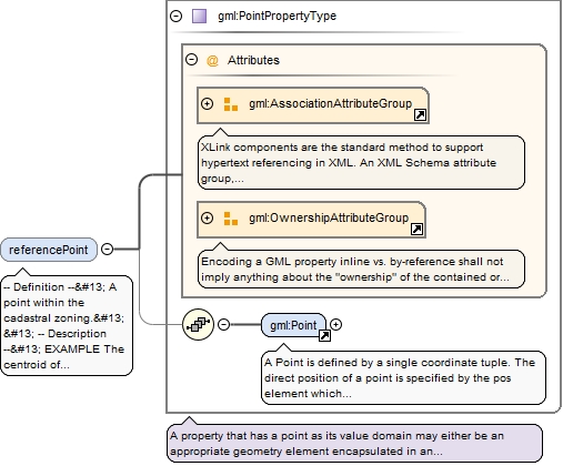 <element minOccurs="0" name="referencePoint" nillable="true" type="gml:PointPropertyType"><annotation><documentation>-- Definition -- A point within the cadastral zoning. -- Description -- EXAMPLE The centroid of the cadastral parcel geometry.</documentation></annotation></element>