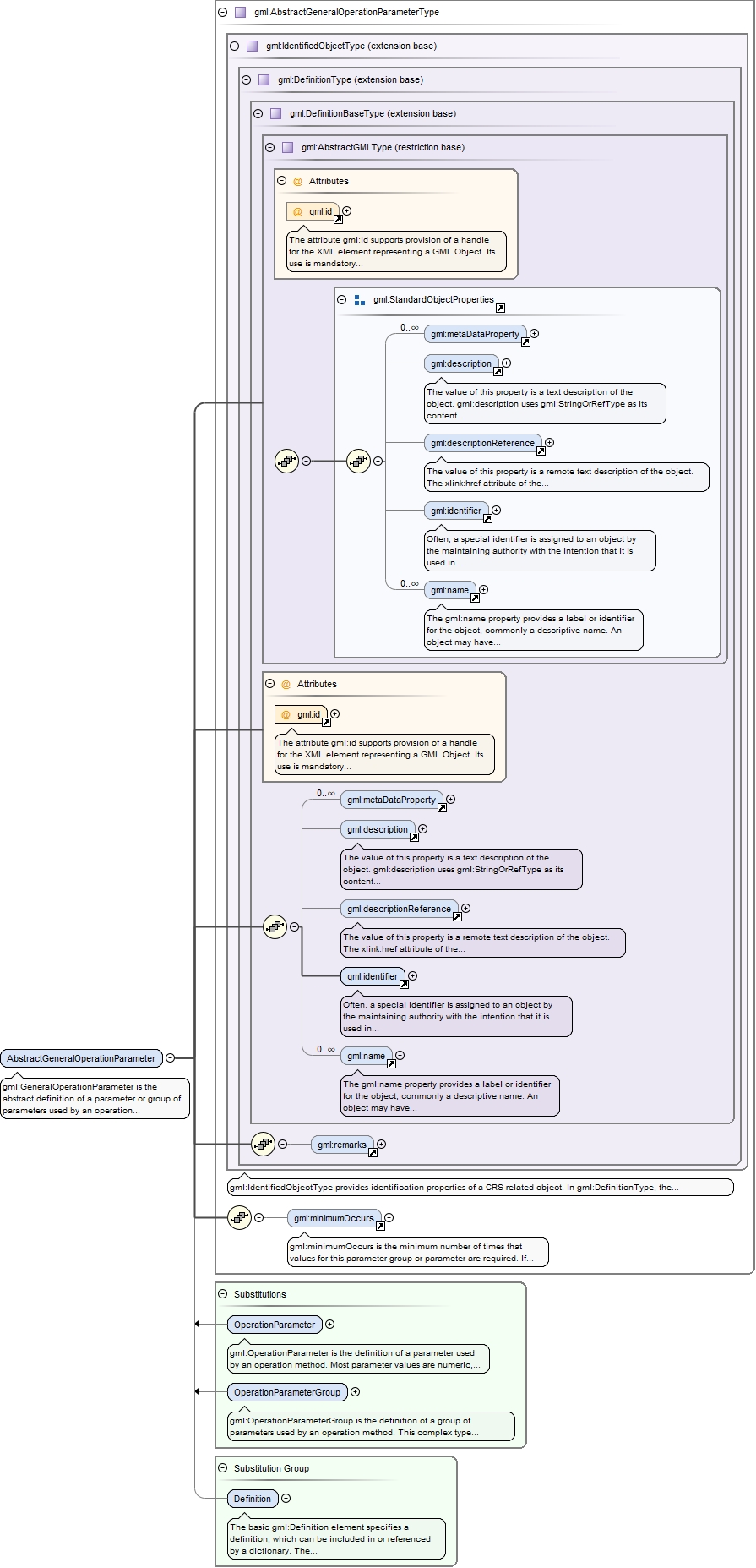 <element name="AbstractGeneralOperationParameter" type="gml:AbstractGeneralOperationParameterType" abstract="true" substitutionGroup="gml:Definition"><annotation><documentation>gml:GeneralOperationParameter is the abstract definition of a parameter or group of parameters used by an operation method.</documentation></annotation></element>
